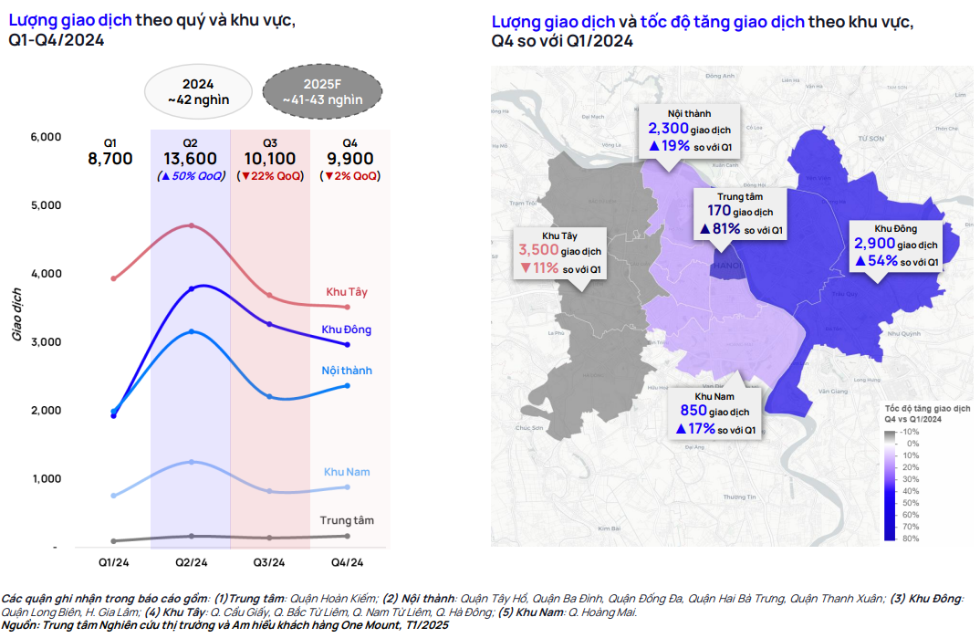 Theo báo cáo mới nhất từ Trung tâm Nghiên cứu thị trường và Am hiểu khách hàng One Mount, dự báo trong năm 2025, giao dịch bất động sản thổ cư tại Hà Nội sẽ đạt khoảng 41.000 - 43.000 giao dịch. Trong đó, các khu vực như Hà Đông, Long Biên và Gia Lâm được dự đoán sẽ tiếp tục là những khu vực có lượng giao dịch cao nhất. Đây là những khu vực có nhiều lợi thế về hạ tầng, tiềm năng phát triển và giá trị đầu tư, đặc biệt là khi các dự án hạ tầng đang được triển khai mạnh mẽ.